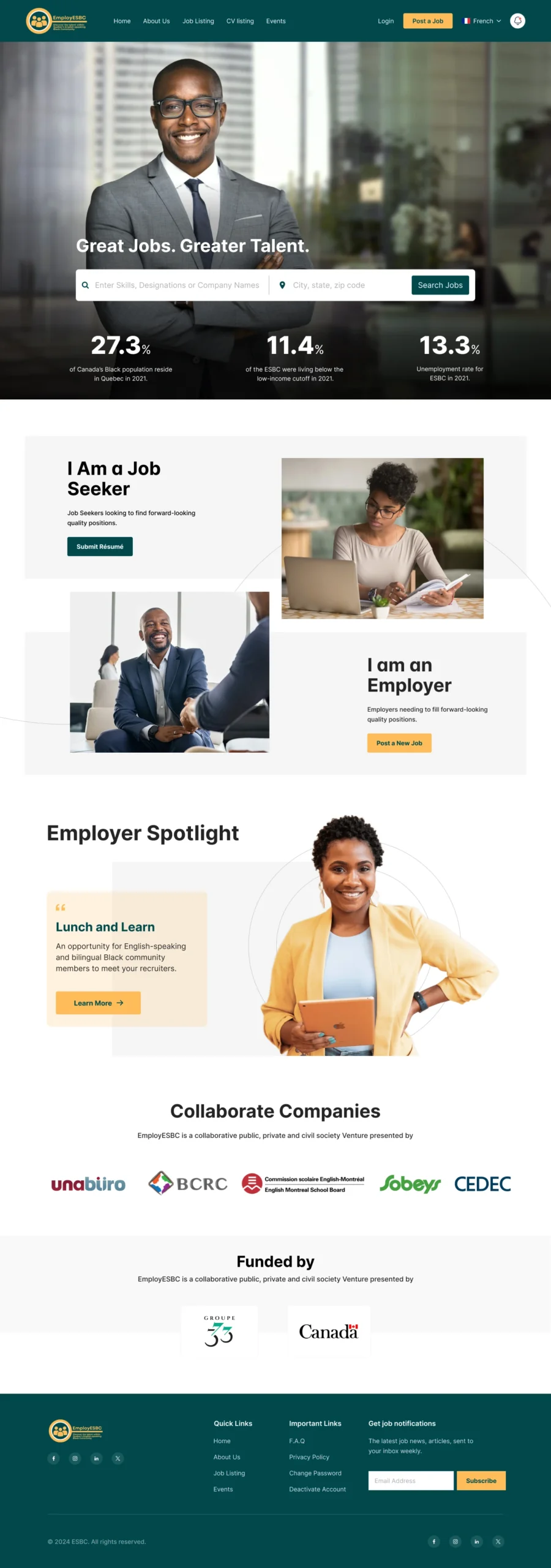 Kinetics partnered with Employ ESBC, a Canada-based initiative launched by the government to promote inclusive hiring for people of all colors, backgrounds, and abilities. The goal was to create a digital platform that connects diverse job seekers with employers actively seeking to build equitable workplaces. In just two months, we delivered a fully functional website and dashboard system that aligned with the initiative’s mission; combining accessibility, clarity, and purpose to support a more representative workforce across Canada.